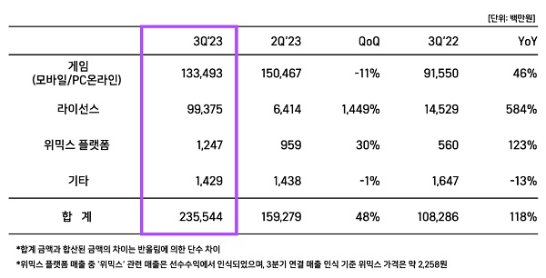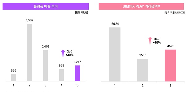 위믹스 플랫폼 매출은 12억 원으로 거래 금액이 증가하면서 전분기 대비 30%, 전년동기 대비 123% 증가했다. 위믹스 플랫폼의 거래금액은 3,581만 위믹스로 전분기 대비 40% 상승했고, 플레이 월렛 누적 가입자 수는 925만 명, 위믹스 플레이 누적 온보딩 게임 수는 42개를 기록했다.