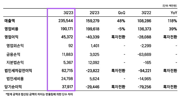 매출은 ‘미르’ IP 중국 라이선스 신규 계약 등으로 창사 이래 최대 분기 매출 기록을 경신하며 전분기 대비 48%, 전년동기 대비 118% 상승했다. 영업이익 및 당기순이익은 매출 증가 및 영업 비용 감소, 환율 상승에 따른 외화 환산 이익 증가 등으로 흑자 전환했다.