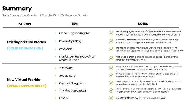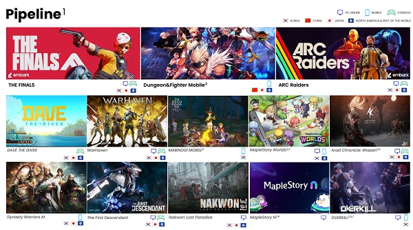 이러한 성과는 ‘메이플스토리’와 ‘FC온라인’, ‘던전앤파이터’ 등의 PC 게임과 ‘FC모바일’, ‘프라시아 전기’, ‘블루 아카이브’ 등 모바일 게임 등을 통해 이뤄졌다. 여기에 더해 중국에서 출시된 ‘메이플스토리M’과 글로벌 시장에 선보인 신작 ‘데이브 더 다이버’의 흥행 덕에 실적이 크게 증가했다.