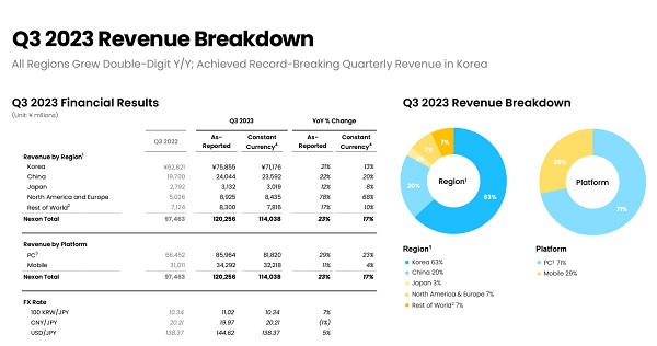 플랫폼별 매출에서는 PC가 7,800억 원, 모바일이 3,111억 원으로 전년동기 대비 PC가 29%, 모바일이 11% 증가했다. 매출 비중은 PC가 71%, 모바일이 29%였다. 특히 한국 지역 PC 매출이 전년동기 대비 40%가 증가한 것이 눈에 띄고,