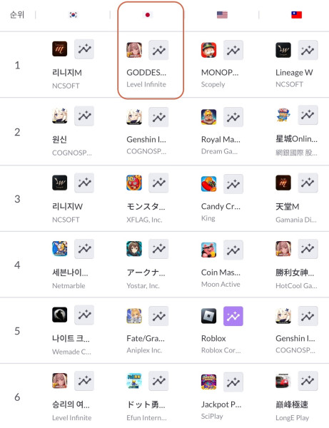 '니케'는 일본 앱스토어 2위, 일본 구글 게임 매출 순위에서도 1위를 기록했다. 국내에서도 구글플레이 최고매출 6위에 등극하며, 변함없는 인기를 달리고 있다.