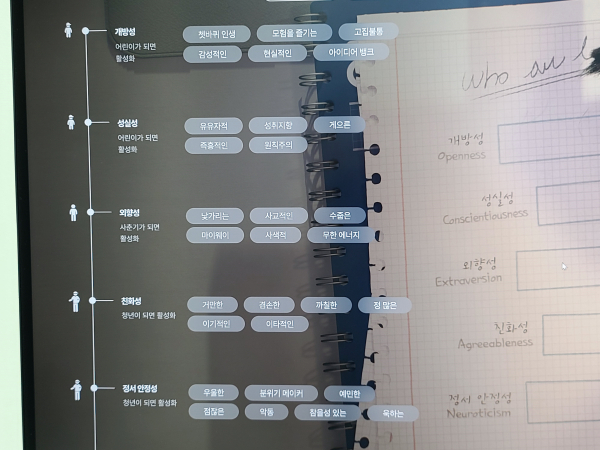 기질은 개방성-성실성-외향성-친화성-정서 안정성 등 5가지 항목이 있고, 그 항목마다 다시 5~6개의 항목이 나눠진다. 그중에서 하나를 선택하면 연령에 따라 활성화가 되며 조이의 성격으로 드러난다.