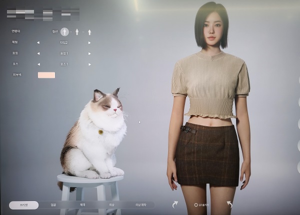 게임을 시작할 때 보이는 건 아주 잘 구현된 고양이와 사람의 그래픽이었다. 언리얼 엔진 5로 제작된 만큼 그래픽은 관련 장르 중 최고의 퀄리티라고 해도 될 정도다. 처음에 자신의 캐릭터인 ‘조이’를 만들 때 성과 이름, 기질과 외모 설정을 진행할 수 있었다. 가족도 추가할 수 있는데, 자녀는 안되고 부부와 동거인만 가능했다.
