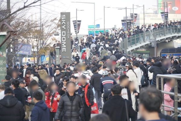 ‘리그오브레전드’의 한 해를 마무리하는 대결인 만큼 유저들의 관심도 뜨겁다. 경기가 시작되기 2시간 전부터 고척돔 인근은 e스포츠 팬들로 발 디딜 틈이 없었다. 이들은 라이엇게임즈가 준비한 굿즈 스토어에서 기념품을 사거나, 고척돔을 배경으로 사진을 남기는 데 열중했다.