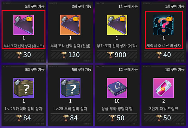 명예 상점에서는 랭크 결투장에서 획득할 수 있는 명예 트로피를 사용한다. 주요 구매 품목은 부하 조각 선택 상자(유니크)와 캐릭터 조각 선택 상자다. 추가로 경험치 칩과 달러도 구매를 추천한다. 부하 조각은 소지한 부하의 등급에 따라 에픽과 전설 조각을 구매해도 무방하다.
