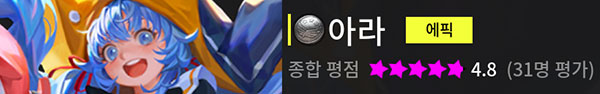 아라(에픽/평점 4.8) - 최근 업데이트를 통해 합류한 신규 부하다. 물방울을 연속으로 발사하는 공격의 연속성이 좋고, 보호막과 상태이상 면역 효과를 주는 물풍선은 아군에게 효과적이다. 적을 물감옥에 가두거나 실명시키는 등의 CC기도 좋은 편이다.