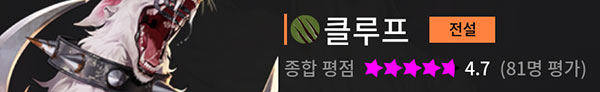 클루프(전설/평점 4.7) - 늑대 타입으로서, 치명타 공격 시 체력을 회복한다. 적의 잡기 공격을 회피할 수 있으며, 잠시 몸을 숨겼다가 기습하는 등 빠른 스피드의 전투를 펼친다. 5등급에서는 치명타 확률이 증가해 치명타 공격과 연계하여 자체 회복이 강화된다.