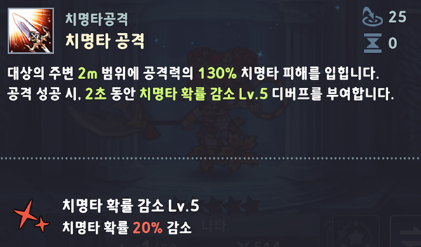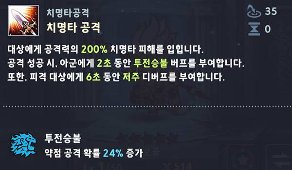 '세븐나이츠 키우기' 초창기에 등장한 영웅인 에이스에 버금가는 딜량에 버퍼와 디버프까지 갖춘 최고의 영웅이다. 치명타 공격을 극대화하기 위해 잠재력은 치명타 확률/피해에 투자하자.