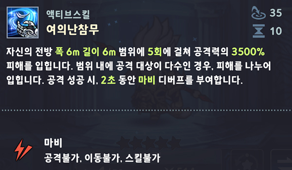 액티브 스킬 '여의난찬무'도 적에게 짧은 시간 동안 마비 디버프를 부여한다. 아울러 넓은 범위에 걸쳐 막대한 데미지를 입히는 공격 스킬로서, 범위 내에 공격 대상이 다수라면 피해가 분산된다.