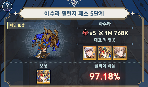 아수라는 스페셜 던전 ‘아수라 챌린저 패스’를 통해 누구나 손쉽게 획득할 수 있다. '챌린저 패스'는 레전드 등급 영웅을 정해진 기간 획득할 수 있는 콘텐츠다. 단계별 도전을 완수하면 보상으로 영웅을 제공하는데, 패배해도 제한 없이 도전이 가능하므로 꾸준히 도전해 아수라 승급에도 도전해 보자.