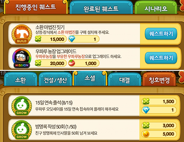 퀘스트와 특정 업적을 완료하면 보상으로 보석을 제공한다. 퀘스트와 업적의 내용 및 보상을 미리 알 수 있기 때문에 미리 할 수 있는 것부터 먼저 수행하자.
