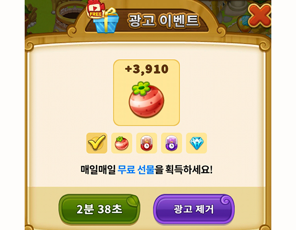 광고를 보고 보석 외에 여러 재화를 얻을 수 있다. 보석은 광고 보상 5번째 보상 품목이라 총 5번의 광고를 봐야 한다. 한 번의 광고를 시청한 뒤에는 일정 시간이 지나야 다음 광고를 볼 수 있으며, 광고 분량은 대부분 30초 내외다.