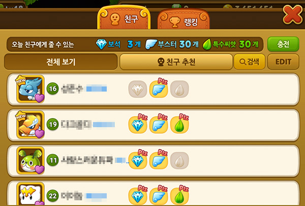 친구에게는 매일 보석 3개, 부스터 30개, 특수씨앗 30개를 줄 수 있다. 마찬가지로 친구도 자신에게 같은 재화를 줄 수 있다. 이왕이면 미리 약속된 친구 및 지인과 함께 서로 몰아주기 방식으로 획득하는 편이 가장 수월하다.