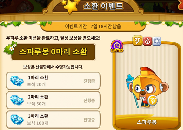 '우파루 오딧세이'는 출시부터 줄곧 소환 이벤트를 진행 중이다. 소환 이벤트는 짧은 기간 동안 막대한 보석을 얻을 수 있는 최고의 수급처다. 현재 진행 중인 소환 이벤트는 스파루몽과 울포다.