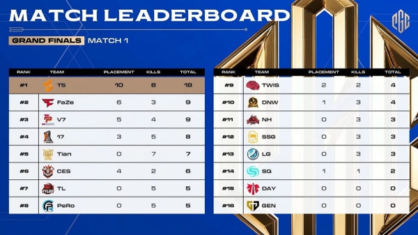 그랜드 파이널 경기는 총 18번의 매치가 진행된다. 첫 매치는 고지에 이점을 살린 T5가 챙겼다. 한국 베로니카 세븐 펀핀(이하 V7)은 마지막 전투까지 생존했지만, 치킨을 차지하지는 못했다. 다나와 e스포츠는 4포인트 3킬을 올렸고, 젠지는 득점하지 못했다.