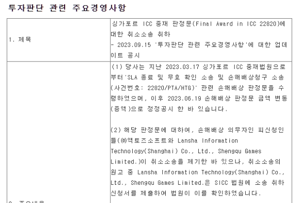 이후 두 회사는 법정 분쟁을 마무리하기 위한 절차에 돌입했다. 하지만 액토즈소프트가 싱가포르 ICC 중재 판정문에 대한 최소소송을 제기해 불씨를 살리는 듯했다.