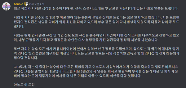 이에 젠지는 아놀드 허 CEO가 다시 나서면서 사태 진화에 나섰다. 아놀드 허 CEO는 26일, 오전과 오후 젠지 공식 디스코드 채널을 통해 사과문을 공지했다. 해당 사항에 대한 정식 내부 조사를 비롯해 관련자 징계, 추후 재발 방지를 위한 신규 정책 도입을 약속했다. 여기에 아놀드 허 CEO가 e스포츠 사업에서 한발 물러남과 동시에 지난 3년간의 연봉을 반납하고, 재정비에 나설 것임을 밝혔다.