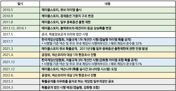 그리고 넥슨은 공정위 조사 시작 이전부터 업계 최초로 강화형 아이템의 확률 정보를 공개하며 자발적 개선에 나서왔다. 위에서 언급된 문제들은 공정위가 조사를 시작하기 이전에 이미 개선이 완료된 상태였다.