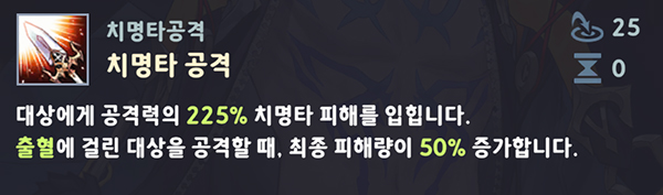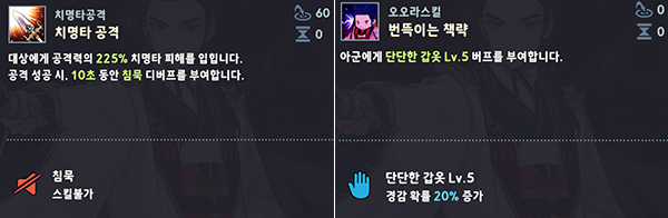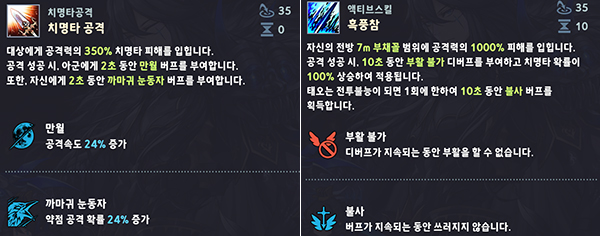 액티브 스킬 '흑풍참'은 범위 공격이다. 부채꼴 범위에 공격력 1,000%의 피해를 입힌다. 특히, 공격에 성공하면 부활 불가 디버프를 부여하고, 치명타 확률이 상승한다. 아울러 태오는 전투불능이 되면 1회에 한해 10초 동안 쓰러지지 않는 불사 버프를 획득한다. 불사 버프는 원래 방어형 탱커 영웅의 전용 버프다. 태오는 딜러지만, 불사 버프로 인해 높은 생존력도 보장됐다.