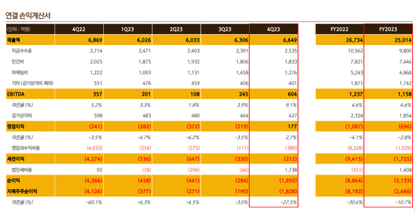 7일 발표된 넷마블의 2023년 연결 기준 4분기 실적에 따르면 매출 6,649억 원, 영업이익 177억 원, 당기순손실 1,950억 원을 기록했다.