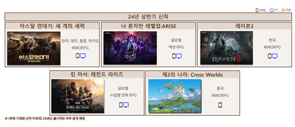 2024년 넷마블은 신작 4종과 중국 출시작 1종을 선보일 계획이다. 국내에서는 '아스달 연대기: 세개의 세력'을 시작으로 '나혼자만 레벨업:어라이즈', '레이븐2', '킹아서 레전드 라이즈'를 선보인다. 중국시장에는 '제2의나라: 크로스월드'를 출시할 예정이다.
