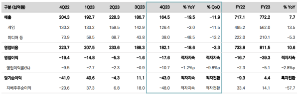 15일 발표한 4분기 연결 실적 매출은 1,645억원으로 전년 대비 19.5% 감소했다. 영업이익은 -176억원, 당기순이익은 -430억원을 기록하면서, 적자지속이 이어졌다. 4분기에는 계절적 비수기 영향으로 게임사업과 콘텐츠 라인업 부재로 미디어사업 매출이 함께 감소했다.