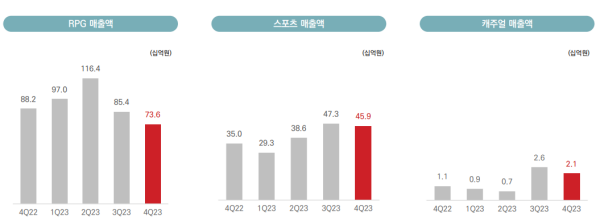 2023년 별도 매출은 5,478억원으로 RPG, 스포츠, 캐주얼 등 다양한 장르가 고른 성장세를 보였다. 별도 영업이익과 당기순이익은 각각 210억원, 499억원을 기록하면서 전년 대비 각각 46.5%, 20.5% 감소했다.