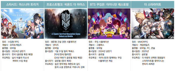 컴투스는 2024년에 3종의 신작 게임을 선보인다. 지난 1월 미국과 영국, 필리핀에서 얼리액세스에 돌입한 '프로스트펑크: 비욘드 더 아이스'는 올 하반기에 글로벌 서비스를 시작한다. 2024년 상반기에는 수집형 RPG '스타시드: 아스니아 트리거'와 쿠킹 시뮬레이션 'BTS 쿠킹온: 타이니탄 레스토랑'을 선보인다. 2025년 상반기에는 MMORPG '더 스타라이트'를 출시해 콘솔 시장에도 뛰어든다.