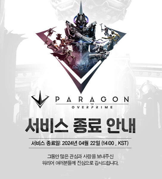 22일 넷마블은 '파라곤: 디 오버프라임' 공식 홈페이지에 서비스 종료 사실을 공지했다. 지난 2022년 얼리엑세스에 돌입한지 약 1년 3개월 만이다. 게임의 정식 종료는 4월 22일로, 관련된 결제 서비스는 종료 공지와 함께 중단됐다.
