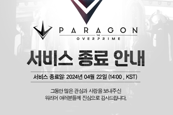 '파라곤: 디 오버프라임'은 2개월간의 종료 수순을 밟은 뒤 4월 22일 서비스를 종료하며, 공식 커뮤니티는 일주일 뒤인 4월 29일 폐쇄한다.