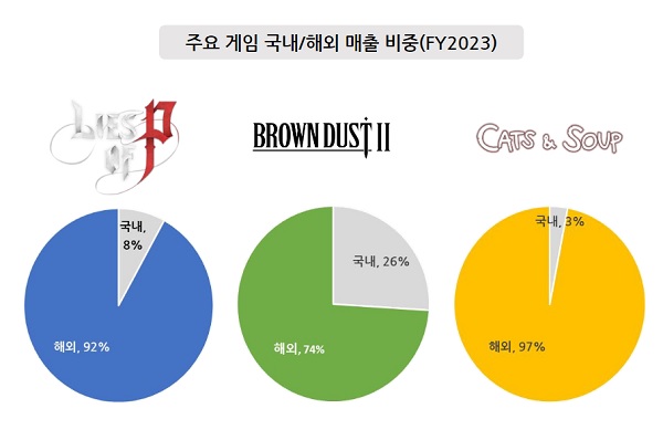 그러면서 PC/콘솔 매출 비중은 47%까지 상승했다. 또한 국내 매출은 2,164억 원으로 전년 대비 9.1% 성장한데 더해, 해외 매출은 1,492억 원으로 전년 대비 55.1%가 성장하며 해외 매출 비중은 41%로 늘어났다. 실제로 ‘브라운더스트2’는 74%, ‘P의 거짓’은 92%, ‘고양이와 스프’는 97%가 해외에서 매출이 발생하고 있다.