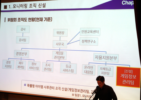 게임위는 이번에 자율지원본부 산하로 게임정보관리팀을 신설해 확률형 아이템 사후관리를 맡는다. 인원은 팀장 1명과 모니터링 22명, 행정업무 4명으로 구성됐다. 그리고 전사적 대응을 위해 게임정보관리 TF를 운영한다.