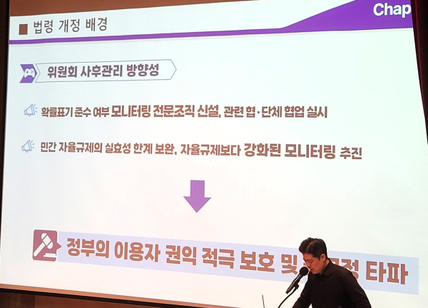 내용에 대한 발표는 게임위 게임정보관리팀 박우석 팀장이 맡았다. 이번 법령 개정은 유저의 의식 증대 및 확률 표기의 권리 요구에 따른 것이다. 자율규제가 실시됐지만 관련된 의심과 불만이 커졌고, 사각지대도 발생했기에 관련 법이 개정됐다. 이를 위해 확률표기 준수 여부를 모니터링하는 전문 조직이 신설되어 자율규제보다 강화된 모니터링이 실시된다.