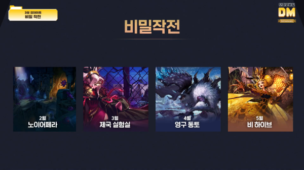 2월에 첫 선을 보인 '비밀작전'이 5월까지 매월 업데이트된다. 최상위 콘텐츠가 아닌 '비밀작전'을 계속 업데이트하는 이유는 각 캐릭터의 항마력에 맞춰 특정 재화를 제공해 많은 유저들이 즐길 수 있게 하기 위함이다.
