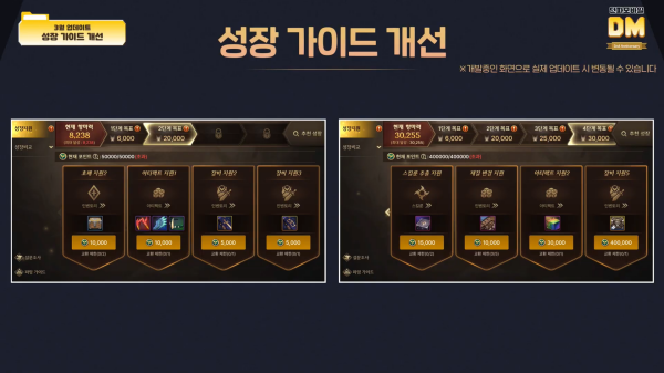 성장 가이드는 현재 목표 항마력에 따라 여러 할 것을 제시해주는 시스템이다. 하지만, 신규 및 복귀 유저에게 다소 부실하게 다가가면서 오히려 플레이를 헤매게 만들기도 했다. 성장 가이드가 실질적인 성장 가이드 역할을 하도록 바뀐다.
