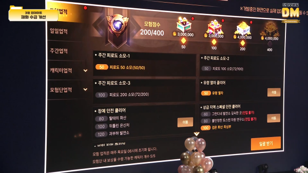 재화 수급을 위해 주간 모험 업적 시스템이 추가됐다. 신규 유저는 평소보다 더 많은 재화를 제공받을 수 있다. 매주 주간 모험 업적을 최종 단계까지 수행할 경우 1,400만 골드를 벌 수 있다. 계정 내 5개 캐릭터에게만 적용될 예정이며, 더 골드가 필요한 캐릭터를 위해 골드 이동 시스템도 준비 중이다. 참고로 긴급 의뢰 시스템은 삭제될 예정이다.