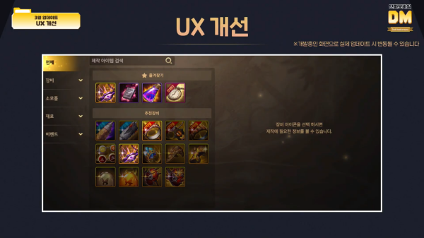 제작 콘텐츠의 UX가 개선된다. 검색이 편해지고, 자주 제작하는 아이템은 즐겨찾기가 가능해진다. 메인화면에 번잡하게 많아진 메뉴도 통합 및 간소화 할 예정이다.