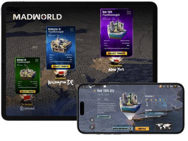매드월드는 지구상의 실제 도시들을 현실감 넘치게 구현하고 있다. 뛰어난 라이브옵스(Live Ops)와 생성형 AI(Generative AI) 기반의 카바인(Carbyne) 플랫폼을 통해 25만 개에 달하는 헥스(Hex) 위에 전 세계 도시들과 방대한 이야기를 제공하는 것. 유저들은 서울, 파리, 두바이 등 현실 세계의 주요 도시를 ‘영토’로 소유하고 자원을 획득할 수 있다. 소유한 영토는 단순히 게임 속에만 존재하는 것이 아니라 블록체인 디지털 상품으로 연계되어 거래할 수 있다. 이는 글로벌 블록체인 메인넷 ‘XPLA’에서 구현될 예정이다.