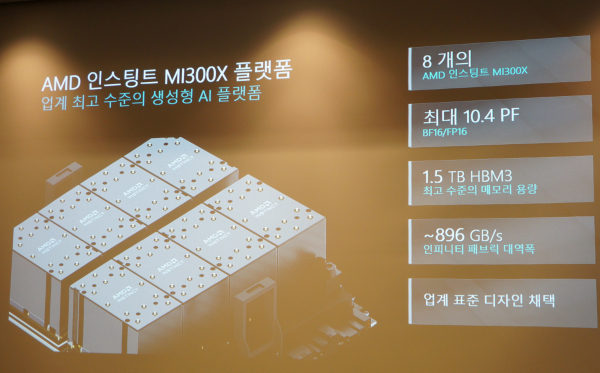 MI300 8개를 모은 모듈 형태의 MI300X 플랫폼은 업계 최고 수준의 생성형 AI 플랫폼으로 출시될 예정이다. 이를 통해 최대 1.5TB의 HBM3 메모리 용량, 최대 10.4PF를 지원한다. 델, HP, 레노버 등 다양한 솔루션 파트너를 통해 제공될 예정이다.