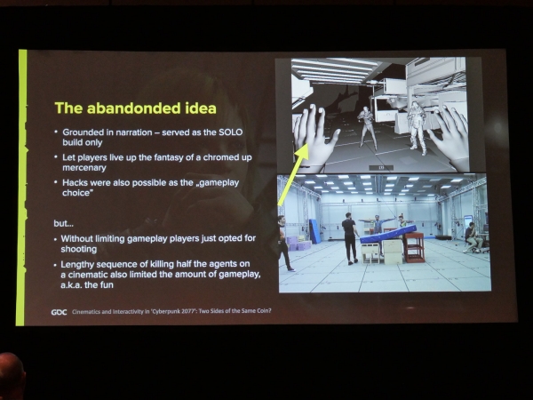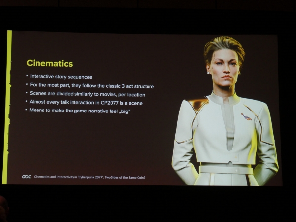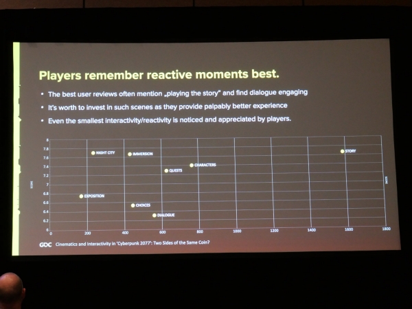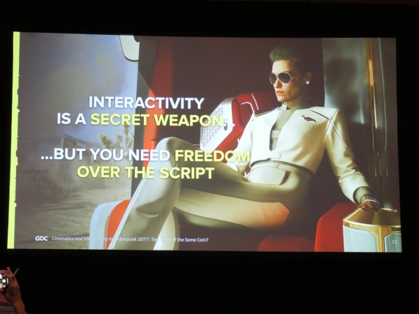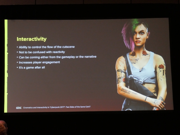 그는 인터랙티브 시네마틱이 플레이어에게 '그냥 보는' 것에서 끝나는 것이 아니라, 스토리 경험을 완화하고 컷 신과 게임플레이 사이의 경계가 모호하지 않게 만들어준다고 설명했다. 컷 신 중에도 NPC의 이야기에 질려서 돌아다니는 경우가 있듯이, 어떻게 하면 스토리에 계속 몰입하게 할 수 있느냐가 '사이버펑크 2077'의 큰 과제였다고 한다.