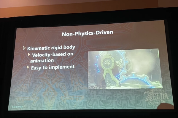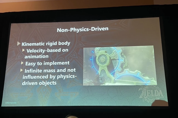 한편, 강체를 애니메이션에서 계산된 속도로 강제해 움직이는 비물리 제어 오브젝트도 존재한다. 키네틱 강체 제어라고 불리는 이 방식은 구현이 간단하고 결과도 알기 쉬워 '티어스 오브 더 킹덤' 개발 초기에도 사용됐다고 한다.