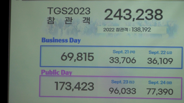 참관객은 243,238명을 기록했다. 비즈니스 데이에 69,815명, 퍼블릭 데이에 173,423명이 참여하면서 전년 대비 10만 명 이상 늘어났다. 또한, 참가사 중 일본 참가사 80% 이상, 해외 참가사는 75% 이상이 만족을 표명했다. 참관객 또한 70% 이상의 높은 만족도를 기록하며 성공적인 게임쇼로 평가됐다.