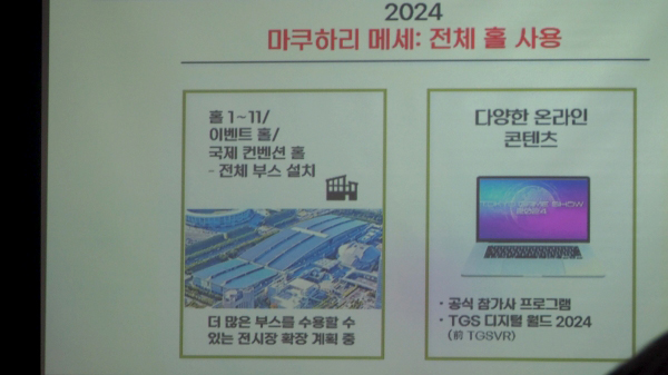 특히, 올해는 1홀부터 11홀까지 전체홀을 모두 사용한다. 더 많은 부스를 사용할 수 있도록 전시장 확장을 계획 중이다. 온라인으로는 공식 참가사 프로그램이나 TGS 디지털 월드 2024를 준비해 온라인에서도 관람을 돕게 된다.