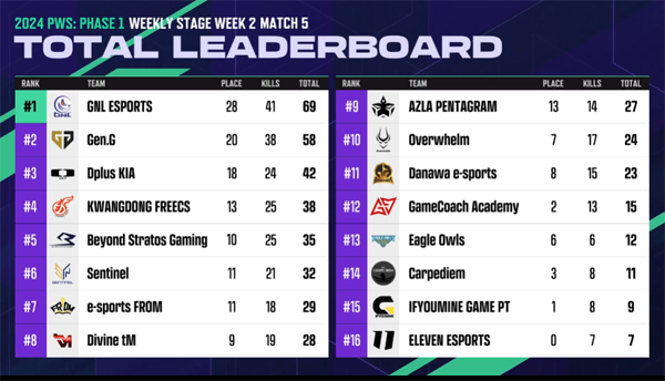 GNL e스포츠가 압도적인 킬 능력을 앞세워 강팀들을 물리치고, PWS 2주차 첫째날 다섯 경기에서 69점으로 1위에 올라섰다. 2위는 2치킨을 가져간 젠지가 차지했다.