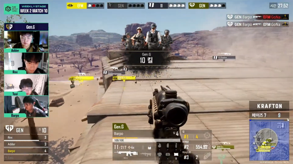 결국 2주차의 주인공은 젠지가 됐다. 2주 2일차 첫 경기인 매치6부터 9킬을 쓸어 담으며 1위인 GNL과 상위권 싸움을 펼쳤고, 난타전이 펼쳐지는 과정에서도 착실히 순위 점수와 킬 점수를 쌓으면서 2위를 유지했다.