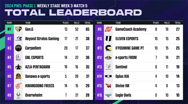PWS 2주차 우승팀인 젠지가 3주 1일차 다섯 경기에서도 놀라운 경기력을 선보였다. 낮은 순위 점수에도 불구하고 높은 킬 점수로 다른 팀들을 압도해 65점으로 1위를 기록했다.