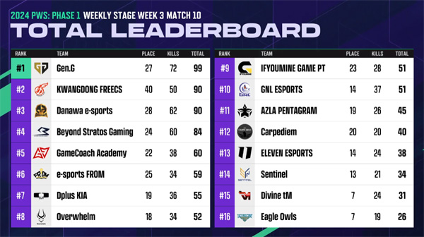 젠지는 2주차 우승에 이어 3주차 우승을 가져가면서 강팀다운 성과를 가져갔다. 2위는 광동, 3위는 다나와, 4위는 BSG가 차지했다. 특히 광동은 매치9와 매치10에서 괴력을 발휘, 2위까지 순위를 끌어올리며 2주 연속 5위의 한을 풀었다.
