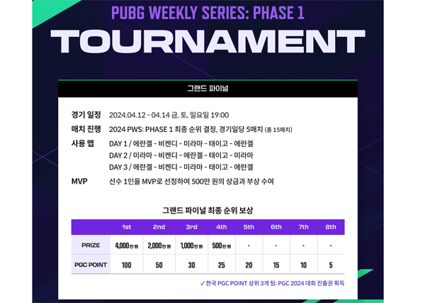 다가오는 12일 저녁, 서울 잠실에서 크래프톤이 주관하는 2024 펍지 위클리 시리즈(PWS) 페이즈1 그랜드 파이널 경기가 열린다. 지난 3주간 국내 대표 배틀그라운드 e스포츠 16개팀이 자웅을 겨뤘으며, 이제 최종 경기를 통해 우승팀의 향방을 결정 짓는다.