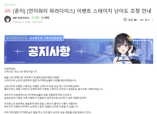 이에 컴투스 측은 지난 4월 11일 밤, 11시에 긴급하게 공지를 내고 대응에 나섰다. 이벤트 스테이지의 난이도를 완하하고, 누구나 즐겁게 즐길 수 있는 콘텐츠로 하향 조정하겠다며, 업데이트 하루만에 수정안을 내놓은 것이다.