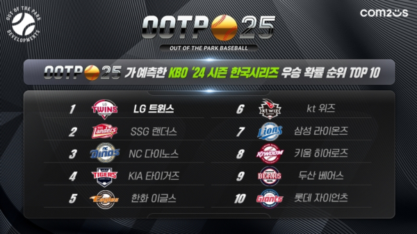 컴투스(대표 남재관)는 자회사 ‘아웃 오브 더 파크 디벨롭먼츠(Out of the Park Developments)’의 MLB, KBO 공식 라이선스 야구 게임 ‘아웃 오브 더 파크 베이스볼 25(이하 OOTP 25)’가 진행한 2024 야구 리그 시뮬레이션 결과를 공개했다.